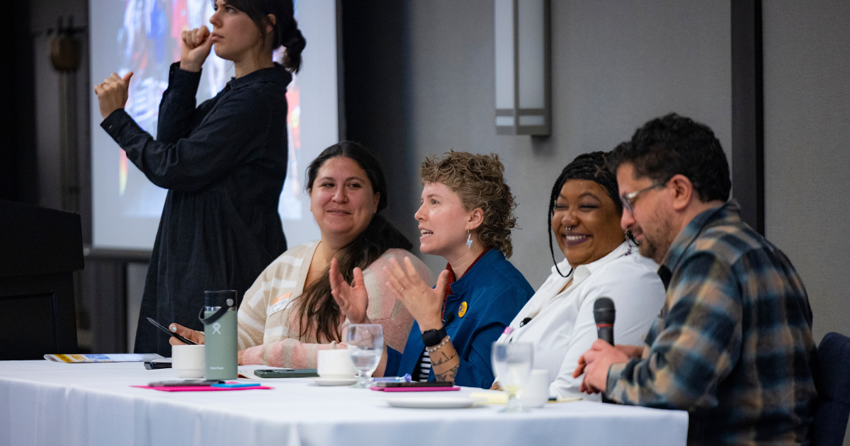 Image Description: Four panelists sit behind a table. One is speaking dynamically and moving their hands as the others smile and laugh. A sign language interpreter is translating in the background.